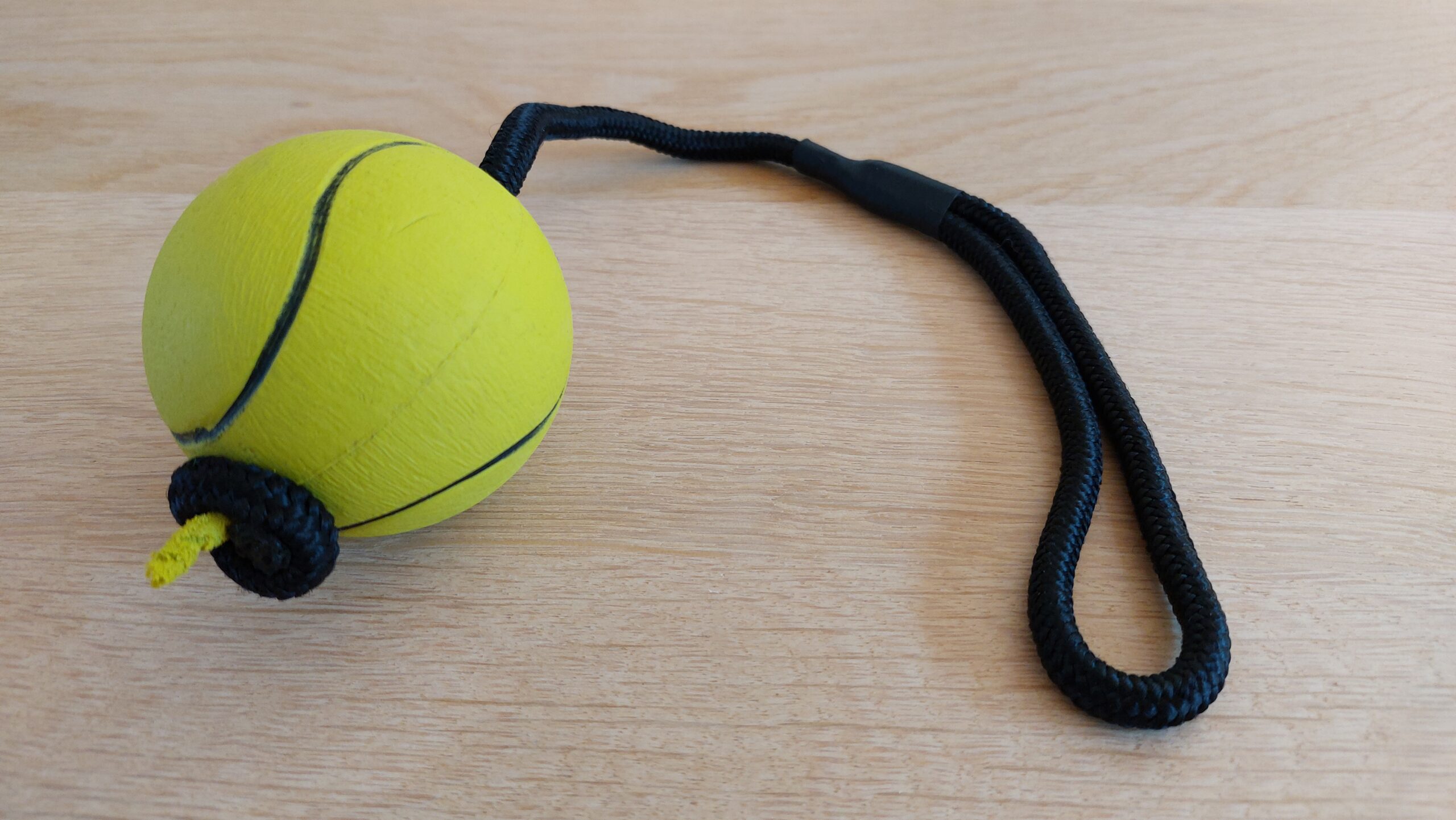 Ik kocht van de week een balletje voor de hond. Zo een van bijtvast rubber met een lus eraan. Kan je hem makkelijk wegslingeren en er is niks leukers voor je hond dan het terug te brengen.